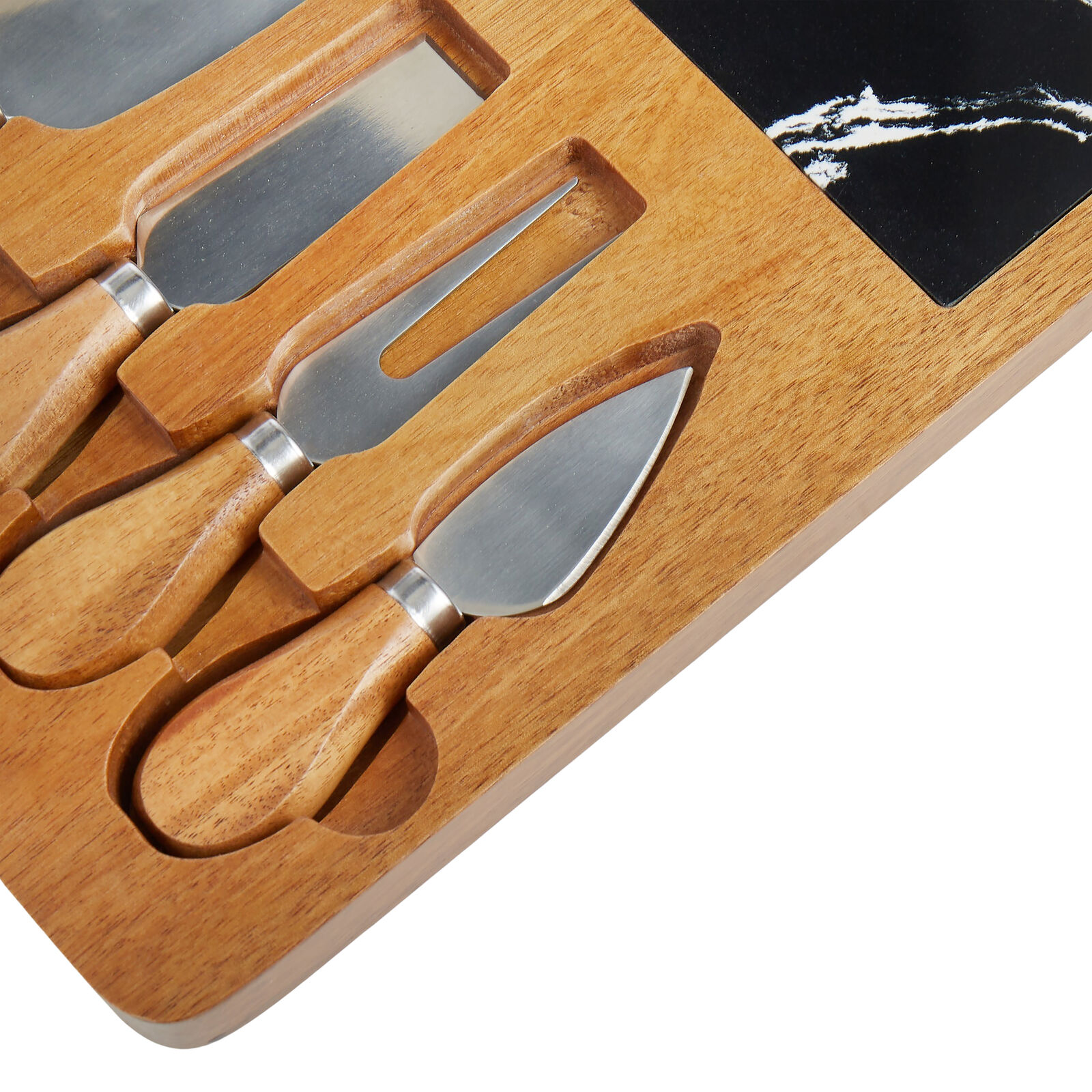 It comes complete with an acacia wooden paddle, artificial marble board and stainless steel knives with acacia wooden handles.