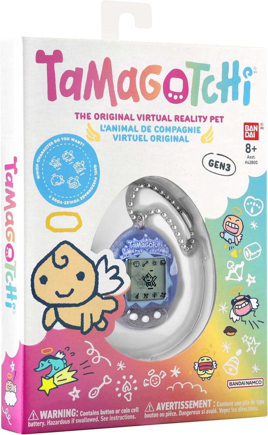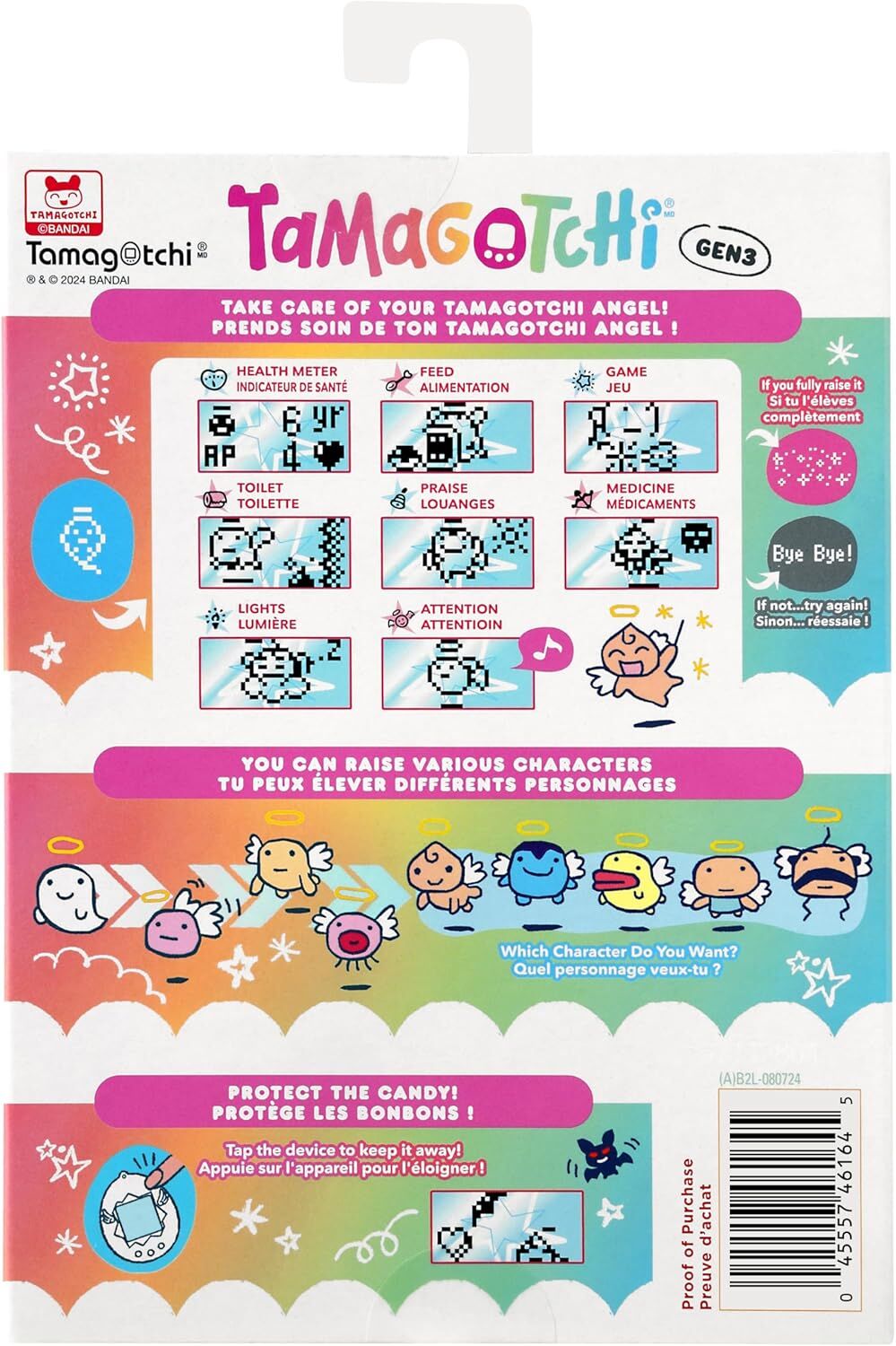 Comes with Angel programming, the device will begin with the Obaketchi Angel (a ghost character), and depending on how you nurture your character will determine which of the 5 adult Tamagotchi Angel characters you will get. You feed it, clean up after it, and even praise it. Plus, you can play the Shooting Star mini-game! Includes the CR2032 battery and attaches to your bag so it goes everywhere!