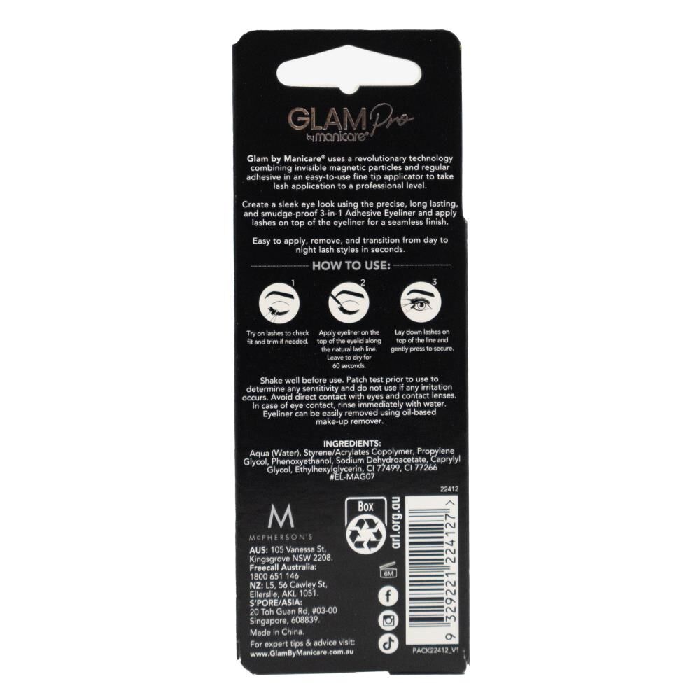 Secure your lashes with confidence using Manicare Glam Pro 3-in-1 Adhesive Eyeliner. Designed for effortless application, this innovative eyeliner combines precision black liner with dual-hold adhesive technology.