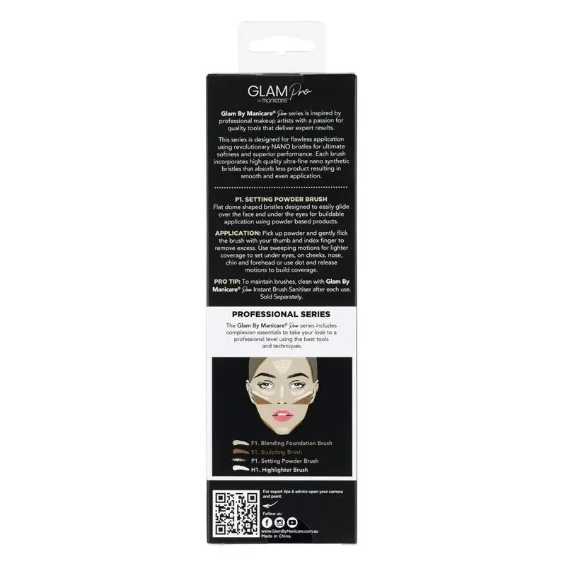 Glam by Manicare® Pro P1. Setting Powder Brush uses flat dome shaped bristles designed to easily glide over the face and under the eyes for buildable application using powder based products.
